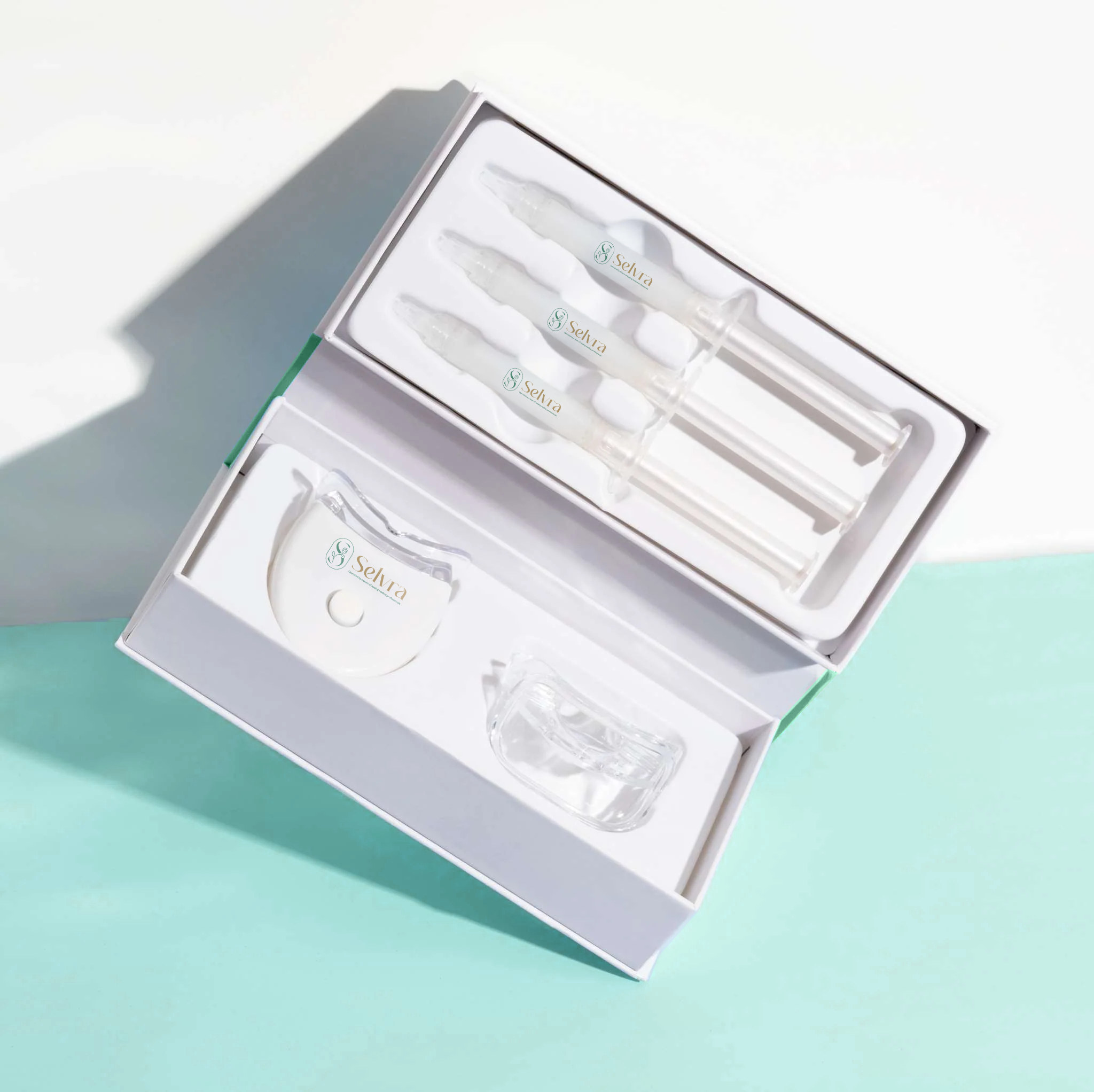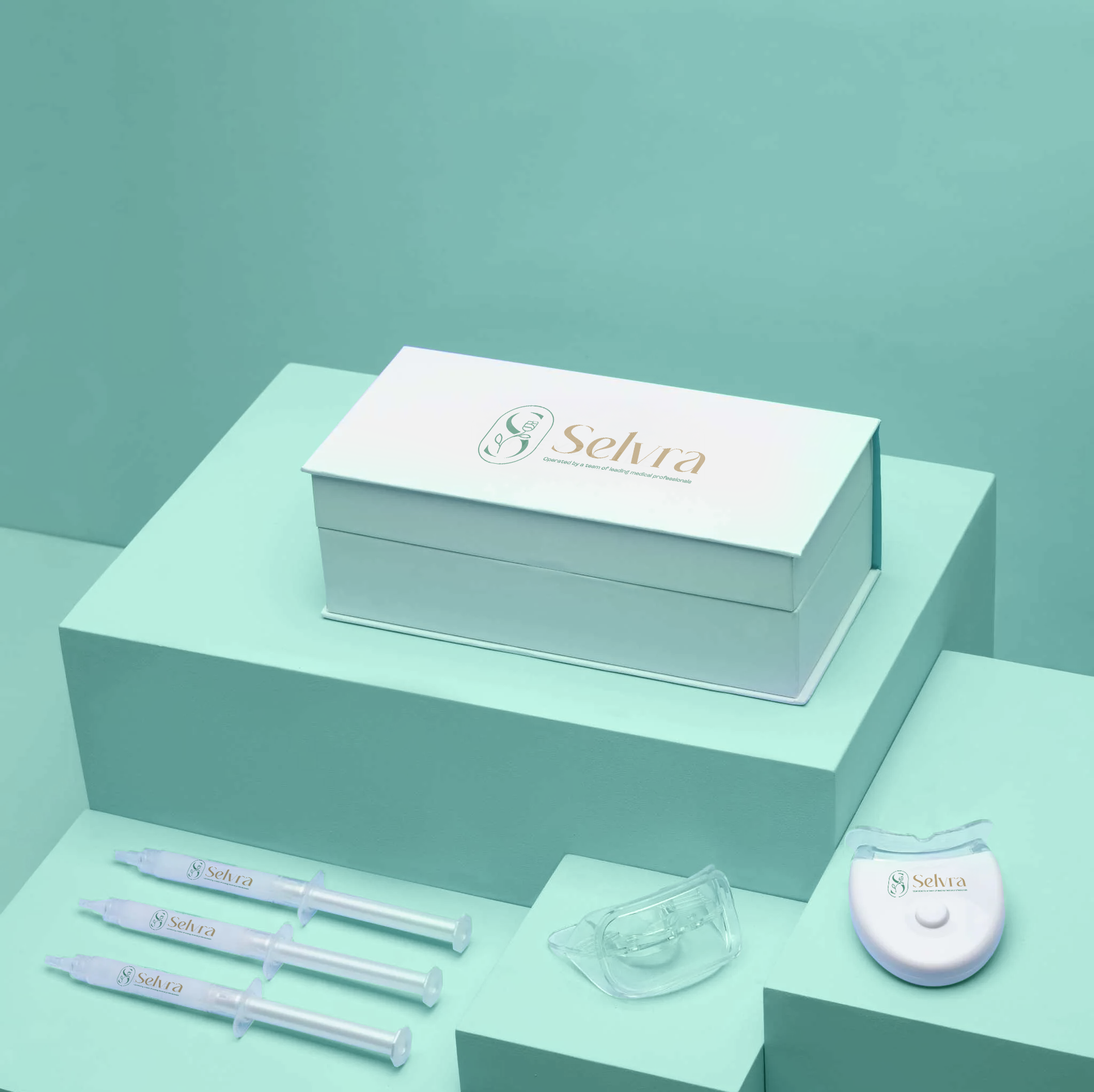 Selvra presents a complete at home teeth whitening kit made with high quality components, including whitening gel syringes, a mouth tray, and an LED light device.